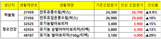 [가격인상] 하늘빛&청오건강 5품목 가격인상 안내
